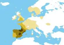 | Highest frequencies | Gallo-Iberians (Basques, Catalans, Galicians, Asturians, Gascons, Béarnese and others) |
