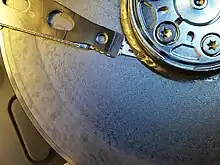 - Head crash: a head may contact the rotating platter due to mechanical shock or other reason. At best this will cause irreversible damage and data loss where contact was made. In the worst case the debris scraped off the damaged area may contaminate all heads and platters, and destroy all data on all platters. If damage is initially only partial, continued rotation of the drive may extend the damage until it is total.[14]