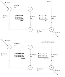 The Hardy Cross method can be used to calculate the flow distribution in a pipe network. Consider the example of a simple pipe flow network shown at the right. For this example, the in and out flows will be 10 liters per second. We will consider n to be 2, and the head loss per unit flow r, and initial flow guess for each pipe as follows: