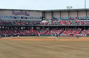 Hawks Field at Haymarket Park is a baseball stadium in the Haymarket District of Lincoln, Nebraska. It is less than a mile west of the University of Nebraska–Lincoln (NU) and is the home venue of the school's baseball team and the Lincoln Saltdogs of the American Association of Professional Baseball. The thirty-two acre Haymarket Park complex, jointly financed by the city of Lincoln and NU, was completed in 2001 at a cost of $29.53 million ($48.8 million in 2022 dollars[1]). Hawks Field is adjacent to the smaller Bowlin Stadium, which hosts Nebraska's softball team.