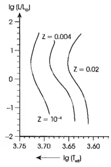 The diagram to the right shows how Hayashi tracks change with changes in chemical composition. Z is the star's metallicity, the mass fraction not accounted for by hydrogen or helium. For any given hydrogen mass fraction, increasing Z leads to increasing molecular weight. The dependence of temperature on molecular weight is extremely steep—it is approximately