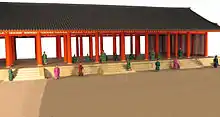 In the latter half of the Nara period, the Great Hall of State and the Halls of State compound that comprised the centre of politics shifted to the eastern sector of the precinct. The Mibu Gate served in effect as the main gate to the palace.