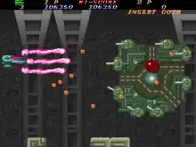 Depending on the settings in the arcade version, the title uses either a checkpoint system in which a downed single player will start off at the beginning of the checkpoint they managed to reach before dying, or a respawn system where their ship immediately starts at the location they died at.[6] Getting hit by enemy fire or colliding against solid stage obstacles will result in losing a life, as well as a penalty of decreasing the ship's firepower and speed to his original state and once all lives are lost, the game is over unless the players insert more credits into the arcade machine to continue playing. Although there is an ending, the game loops back to the first stage after completing the last stage as with previous titles from Toaplan, with each one increasing the difficulty and enemies fire denser bullet patterns.