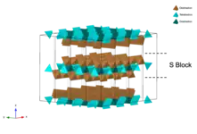 The S block is very common in hexaferrites, which has a chemical formula of MeS6O82+. MeS are smaller metal cations, for example, Fe and other transition metals[2] or noble metals.[3] The S block is essentially a slab cut along the plane of an AB2O4 spinel. Each S block has one A layer and one B layer. The A layer features MeS-centered tetrahedron and MeS-centered octahedron, while the B layer is made up of edge-sharing MeS-centered octahedron. Both A and B layers have the same chemical formula of MeS3O42+.