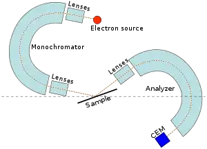 The monochromator is usually a concentric hemispherical analyser (CHA). In more sensitive setups an additional pre-monochromator is used. The task of the monochromator is to reduce the energy of the passing electrons to some eV due to the help of electron lenses. It further lets only those electrons pass which have the chosen initial energy. To achieve a good resolution it is already important to have incident electrons of a well defined energy one normally chooses a resolution of for the monochromator. This means, the electrons leaving the monochromator with e.g. 10 eV have an energy accurate to 10−1 eV. The beam's flux is then in the orders of 10−8 A to 10−10 A. The radii of the CHA are in the order of several 10 mm. And the deflector electrodes have a saw tooth profile to backscatter electrons which are reflected from the walls in order to reduce the background of electrons with the wrong Ei. The electrons are then focused by a lens system onto the sample. These lenses are, in contrary to those of the emitter system very flexible, as it is important is to get a good focus on the sample. To enable measurements of angular distributions all those elements are mounted on a rotate able table with the axis cantered at the sample.Its negative charge causes the electron beam to broaden. What can be prevented by charging the top and bottom plates of the CHA deflectors negative. What again causes a change in the deflection angle and has to be considered when designing the experiment.