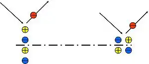 Alternatively there is a more unfamiliar model which only holds exactly for perfect conductors: A unit cell at the surface does not have a homogeneous surrounding, hence it is supposed to have an electrical dipole moment. When a molecule is adsorbed to the surface there can be an additional dipole moment and the total dipole moment P is present. This dipole moment causes a long range electronic potential in the vacuum above the surface. On this potential the incident electron can scatter inelastically which means it excites vibrations in the dipole structure. The dipole moment can then be written as . When the adsorbate sticks to a metal surface, imaginary dipoles occur as shown in the figure on the right. Hence for an adsorbed dipole normal to the surface the dipole moment "seen" from the vacuum doubles. Whereas the dipole moment of a parallel to the surface adsorbed dipole vanishes. Hence an incident electron can excite the adsorbed dipole only when it is adsorbed normal to the surface and the vibrational mode can be detected in the energy loss spectrum. If the dipole is adsorbed parallel then no energy losses will be detected and the vibrational modes of the dipole are missing in the energy loss spectrum. When measuring the intensity of the electron energy loss peaks and comparing to other experimental results or to theoretical models it can also be determined whether a molecule is adsorbed normal to the surface or tilted by an angle.