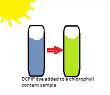 It is possible to introduce an artificial electron acceptor into the light reaction, such as a dye that changes color when it is reduced. These are known as Hill reagents. These dyes permitted the finding of electron transport chains during photosynthesis. Dichlorophenolindophenol (DCPIP), an example of these dyes, is widely used by experimenters. DCPIP is a dark blue solution that becomes lighter as it is reduced. It provides experimenters with a simple visual test and easily observable light reaction.[8]