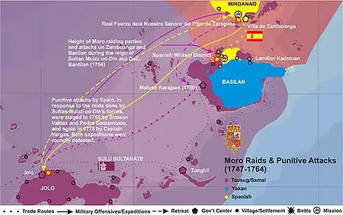 In 1755, contingent of 1,900 men led by captains Simeon Valdez and Pedro Gastambide was sent to Jolo to avenge for the raids by Sultan Muiz ud-Din. But were roundly defeated. In 1775, after Moro raid on Zamboanga, Capitan Vargas led a punitive expedition against Jolo but was repulsed.