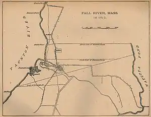 1812 Map of Fall River. The diagonal line represents the border between Massachusetts and Rhode Island