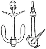 Killicks are primitive anchors formed by lashing tree branches to a stone for weight. Greeks were using mushroom anchors by 400 B.C. fashioned from a flattened stone with a hole drilled through the center and a triangular eyebolt at the crown for "tripping" the anchor out of its bed.[2]