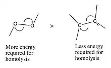 • Certain intramolecular bonds, such as the O–O bond of a peroxide, are weak enough to spontaneously homolytically dissociate with a small amount of heat.