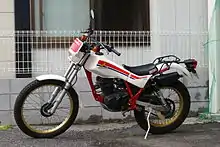 The Reflex also has the tight turning radii typical of trials motorcycles.[1] Its steering column can almost turn completely perpendicular to the bike's frame. It's designed to be a stand up motorcycle, though it does have a seat and lights for road use. With light sprocket modifications it is a functional bike for motorcycle trials.