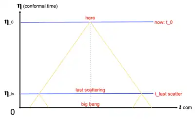 Note we use conformal time in the following diagrams. Conformal time describes the amount of time it would take a photon to travel from the location of the observer to the farthest observable distance (if the universe stopped expanding right now).