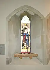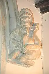 The Church of England parish church of Saint Giles seems to have been built late in the 12th century. The Early English Gothic[7] south aisle, including the south door and three and a half bay south arcade date from this period. From this time the east wall of the chancel had a trio of three stepped lancet windows. The early Decorated Gothic south transept was added late in the 13th or early in the 14th century[7] as a chantry chapel. The south porch was added late in the 14th century.[3] Around 1400 the present west tower and tower arch were built. The tower arch features two unusual almost life-size sculptures of human figures: one playing the bagpipes and the other showing an expression of amazement.[7] Also in the 15th century the pitch of the nave roof was greatly reduced in typical Perpendicular Gothic style.[7] Late in the 15th century, Perpendicular Gothic windows were inserted in both sides of the chancel and the north wall of the nave. The Perpendicular Gothic piscinae in the chancel and south transept are also 15th century.[3]