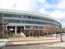 Technology Square, also known as "Tech Square", is located across the Downtown Connector and embedded in the city east of East Campus.[22] Opened in August 2003 at a cost of $179 million, the district was built over run-down neighborhoods and has sparked a revitalization of the entire Midtown area.[23][24][25] Connected by the recently renovated Fifth Street Bridge, it is a pedestrian-friendly area comprising Georgia Tech facilities and retail locations.[23][26] One complex contains the College of Business Building, holding classrooms and office space for the Scheller College of Business, as well as the Georgia Tech Hotel and Conference Center and the Georgia Tech Global Learning Center.[27] Another part of Tech Square, the privately owned Centergy One complex, contains the Technology Square Research Building (TSRB), holding faculty and graduate student offices for the College of Computing and the School of Electrical and Computer Engineering, as well as the GVU Center, a multidisciplinary technology research center.[23] The Advanced Technology Development Center (ATDC) is a science and business incubator, run by the Georgia Institute of Technology, and is also headquartered in Technology Square's Centergy One complex.