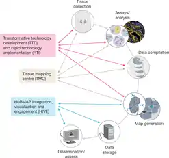 - 1 2 3 Snyder MP, Lin S, Posgai A, Atkinson M, Regev A, Rood J, et al. (HuBMAP Consortium) (October 2019). "The human body at cellular resolution: the NIH Human Biomolecular Atlas Program". Nature. 574 (7777): 187–192. Bibcode:2019Natur.574..187H. doi:10.1038/S41586-019-1629-X. PMC 6800388. PMID 31597973.