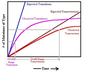 To overcome the effects of saturation, HVR analysis relied on the transversional distance between humans and chimpanzees.[10] A transition to transversion ratio was applied to this distance to estimate sequence divergence in the HVR between chimpanzees and humans, and divided by an assumed TCHLCA of 4 to 6 million years.[11] Based on 26.4 substitutions between chimpanzee and human and 15:1 ratio, the estimated 396 transitions over 610 base-pairs demonstrated sequence divergence of 69.2% (rate * TCHLCA of 0.369), producing divergence rates of roughly 11.5% to 17.3% per million years.