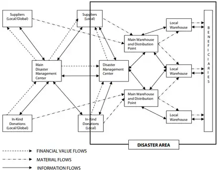 • The flow of material: the flow of products from donors to beneficiaries, including food, blankets, medicines, and water, and the reverse flow of returned products after disasters.