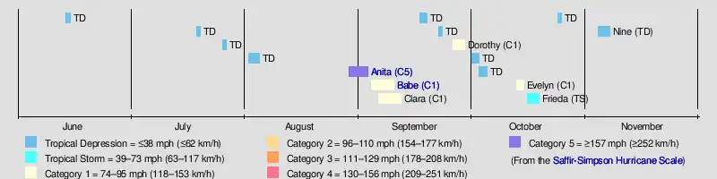 Tropical cyclogenesis in the 1977 Atlantic hurricane season began with the development of a tropical depression on June 13. Activity briefly halted, until two other tropical depressions developed in the second half of July. A fourth tropical depression formed in early August.[2] Later that month, Hurricane Anita developed on August 29. It was the latest in the season for a first named storm to form in the satellite era.[8] September, the climatological peak of hurricane season, was its most active month.[6] Five tropical cyclones developed, including two tropical depressions,[2] and hurricanes Babe, Clara, and Dorothy.[6] There were also five tropical cyclones in October – three tropical depressions,[2] Hurricane Evelyn, and Tropical Storm Frieda.[6] The final tropical cyclone of the season, Tropical Depression Nine, developed between the Greater Antilles and Bermuda on November 3 and dissipated by November 7.[2]