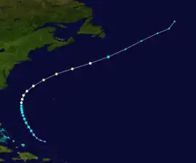 From August 14 onwards, Gert strengthened markedly, developing persistent deep convection and a central dense overcast. At 06:00 UTC on August 15, Gert became the second hurricane of the 2017 Atlantic hurricane season as sustained winds rose to 75 mph (121 km/h).[2] While an approaching mid-latitude trough began to accelerate Gert towards the northeast, Gert continued to intensify, developing an eye just 10 nautical miles (12 mi; 19 km) across. At 18:00 UTC on August 16, Gert reached its peak intensity with winds of 110 mph (180 km/h) and a minimum central pressure of 962 mbar (962 hPa; 28.4 inHg), ranked as Category 2 on the Saffir–Simpson scale.[2] Racing off to the east-northeast, Gert soon passed beyond the northern wall of the Gulf Stream, marking a significant decrease in SSTs. Compounded by increasing vertical wind shear and drier air,[6] Gert began to weaken and its cloud pattern rapidly deteriorated; the system degraded to a tropical storm by 12:00 UTC on August 17. Six hours later, Gert transitioned into an extratropical cyclone 335 miles (539 km) southeast of St. John's, Newfoundland. The weakening cyclone continued northeast over the open Atlantic Ocean, before dissipating by 00:00 UTC on August 19.[2] The remnant energy and moisture of the system merged with another extratropical cyclone to the northwest, which later went on to affect Ireland and the United Kingdom.[7]