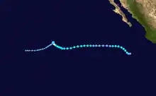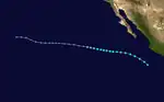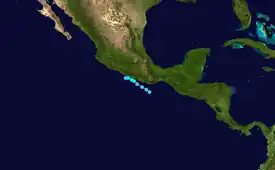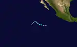 A westward-moving tropical wave from Africa crossed Central America into the eastern Pacific in late June, coalescing into a tropical depression at 12:00 UTC on July 2 well southwest of the southern tip of the Baja California Peninsula.[16] Steered westward by low-level flow, the depression failed to organize amid wind shear and cooler sea surface temperatures,[17] instead degenerating into a remnant low at 00:00 UTC on July 4. The post-tropical cyclone dissipated a day later.[16]