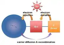 TiO2 nanoparticles are synthesized in several tens of nanometer scales (~100 nm). In order to make a photovoltaic cell, molecular sensitizers (dye molecules) are attached to the titania surface. The dye-absorbed titania is finally enclosed by a liquid electrolyte. This type of dye-sensitized solar cell is also known as a Grätzel cell.[25] Dye-sensitized solar cell has a disadvantage of a short diffusion length. Recently, supermolecular or multifunctional sensitizers have been investigated so as to enhance carrier diffusion length.[26] For example, a dye chromophore has been modified by the addition of secondary electron donors. Minority carriers (holes in this case) diffuse to the attached electron donors to recombine. Therefore, electron-hole recombination is retarded by the physical separation between the dye–cation moiety and the TiO2 surface, as shown in Fig. 5. Finally, this process raises the carrier diffusion length, resulting in the increase of carrier lifetime.