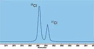 Naturally abundant chlorine consists of two isotopes, 35Cl and 37Cl, in a ratio of approximately 3:1. While the spring constants are nearly identical, the disparate reduced masses of H35Cl and H37Cl cause measurable differences in the rotational energy, thus doublets are observed on close inspection of each absorption line, weighted in the same ratio of 3:1.