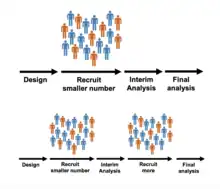 Group sequential Sample size, by a set interval at a time. Sample sizes can be changed. These trials usually change the sample size by adding or removing set-blocks of patients such as adding 20 patients at a time, and then re-evaluating. This type of design is explained in detail on PANDA.[5]