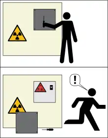 The symbol is to be placed close to the source, either on its shield or a point of access. The smallest the symbol should be produced is 3.0 centimetres (1.2 in), which makes its placement on most sources difficult due to their small size.[4] The symbol is intended to be hidden from view under normal conditions, and only be revealed to a person when they start attempting to dismantle a piece of equipment, such as removing outer housing of equipment.[4]
