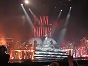 The show continued with a short medley performed by her backup singers, The Mamas, followed by another video interlude, featuring Sasha Fierce.[32] Beyoncé appeared on stage after a gong bang; she was lifted out of a 20-foot train by a harness and performed "Baby Boy" while high-stepping and front-flipping above the audience.[18][26] She was then lowered to the B-stage where she finished the song and continued with a cover Dawn Penn's "You Don't Love Me (No, No, No)". A stripped-down version of "Irreplaceable" was sung afterwards with frequent crowd interactions.[31] Beyoncé then continued with "Check On It" and a medley of Destiny's Child hits including "Bootylicious", "Jumpin' Jumpin'", "Independent Women", "Bills, Bills, Bills" and "Survivor".[30][31] Performances of "Upgrade U" and "Video Phone" followed. For the performance of the two songs, Beyoncé was accompanied by two female dancers and three male dancers, one of whom recorded a live stream of her with a camera throughout the routine during the performance of the latter song.[33] This was followed by a rendition of "Say My Name" where she interacted with members of the audience, asking them to say her name.[35] The concert followed back at the main stage where for the penultimate section, Beyoncé appeared wearing a gown and singing "At Last". A footage of her performance of the song at Barack Obama's inauguration as President of the United States, video images of civil rights era footage and snippets from her performance of the song in the movie, Cadillac Records (2008) were shown on the screen behind here.[18][19][31] "Listen" was performed afterwards.[26] This was followed by a YouTube video interlude featuring imitations of the choreography of "Single Ladies (Put a Ring on It)" performed by fans as well as Barack Obama and Justin Timberlake.[27][31] Beyoncé then performed the song's trademark choreography accompanied by two female back-up dancers.[18] For the finale, an extended version of "Halo" was performed while the singer descended from the stage to shake hands with fans in the front rows.[31][36] She then went to the top of the staircase and repeatedly said "I am", awaiting the crowd to say it back. The letters "I am... yours" were displayed on the screen as she exited the stage.[31][36]