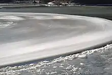 Ice discs form on the outer bends in a river where the accelerating water creates a force called 'rotational shear', which breaks off a chunk of ice and twists it around.[2] As the disc rotates, it grinds against surrounding ice smoothing into a circle.[3] A relatively uncommon phenomenon, one of the earliest recordings is of a slowly revolving disc spotted on the Mianus River and reported in an 1895 edition of Scientific American.[4][5]