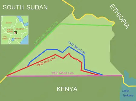 In 1931 the Red Line (the Glenday Line) was drawn to represent the northern boundary of Turkana grazing. "In a series of agreements from 1929 to 1934, the Governor-General of the Anglo-Egyptian Sudan and the Governor of Kenya agreed that this Red Line should be accepted as the Turkana grazing boundary."[6][7]