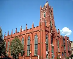 The cornerstone of the original church, located on a lot near the corner of 8th and N Streets took place on October 30, 1864. Martin John Spalding, Archbishop of Baltimore, dedicated the new church on July 2, 1865, the Feast of the Visitation. The parish rapidly outgrew this structure, however, and on November 13, 1870, the cornerstone for the present Gothic Revival church was laid, with construction commencing the following year. Dedicated in 1874, at which time the old structure became the parish and school hall, the church was refurbished in 1939 and 1962–63.[2]