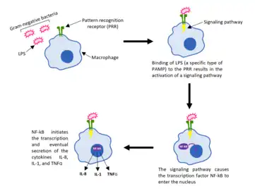 When a foreign pathogen bypasses the physical barriers and enters an organism, the PRRs on macrophages will recognize and bind to specific PAMPs. This binding results in the activation of a signaling pathway which allows for the transcription factor NF-κB to enter the nucleus of the macrophage and initiate the transcription and eventual secretion of various cytokines such as IL-8, IL-1, and TNFα.[5] Release of these cytokines is necessary for the entry of neutrophils from the blood vessels to the infected tissue. Once neutrophils enter the tissue, like macrophages, they are able to phagocytize and kill any pathogens or microbes.