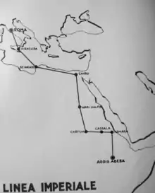 The Imperial Line (Italian Linea dell'Impero or Linea Imperiale) was a flight route of the Italian national airline Ala Littoria between 1935 and 1941 during the Fascist era. It was the longest route in the Italian colonial empire in Africa and "the jewel in Ala Littoria's crown".[1] It connected Rome with Benghazi (Libya), Asmara (Eritrea), Addis Abeba (Ethiopia) and Mogadishu (Somalia). It carried passengers and mail. Italy ultimately lost control of the route during World War II.