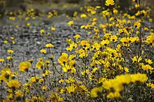 Brittlebush grows up to 30 to 150 centimetres (12 to 59 inches) tall,[1] with fragrant leaves 3–10 cm (1+1⁄4–4 in) long, ovate to deltoid, and silvery tomentose.[2] Arranged in loose panicles above the leafy stems, the capitula are 3–3.5 cm (1+1⁄4–1+1⁄2 in) in diameter. Each has 8–18 orange-yellow ray florets, 6–15 millimetres (1⁄4–9⁄16 in) in length,[2] and yellow or purple-brown disc florets. The fruit measures 3–6 mm (1⁄8–1⁄4 in) and no pappus is visible.[3] During dry seasons the plant goes drought deciduous, shedding all of its foliage, relying on the water stored in its thick stems.[4]
