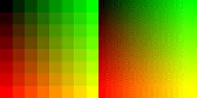 Two images mimicking a gradient of 140 × 140 = 19600 different colors. Both images use the same 64 colors. The image on the right has been dithered. The dithering was done using a non-normalizing dithering algorithm, causing the image to have a slight over-representation of bright pixels.