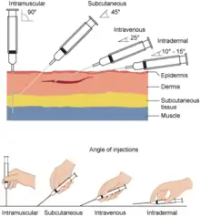 Intradermal injections, abbreviated as ID, consist of a substance delivered into the dermis, the layer of skin above the subcutaneous fat layer, but below the epidermis or top layer. An intradermal injection is administered with the needle placed almost flat against the skin, at a 5 to 15 degree angle.[16] Absorption from an intradermal injection takes longer than when the injection is given intravenously, intramuscularly, or subcutaneously. For this reason, few medications are administered intradermally. Intradermal injections are most commonly used for sensitivity tests, including tuberculin skin tests and allergy tests, as well as sensitivity tests to medications a person has never had before. The reactions caused by tests which use intradermal injection are more easily seen due to the location of the injection, and when positive will present as a red or swollen area. Common sites of intradermal injections include the forearm and lower back.[16]