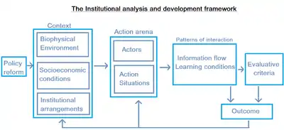 The Institutional Analysis and Development framework (IAD) was developed by Elinor Ostrom, an American political scientist, who was the first woman to receive the Nobel Memorial Prize in Economic Sciences in 2009.[1] The IAD relates a set of concepts to help in the analysis of commons, such as fishery stocks, woodlands. Ostrom explored which institutional structures support arrangements that handle those resource stocks in a sustainable way, balancing individuals' use with the interest of a wider public. Under the rational choice models, the IAD was devised in an attempt to explain and predict outcomes by formally exploring and documenting the governance structures, the actors' positions, and the informal and formal rules devised for individuals to extract resources from the commons resource. Thus, the IAD is a systematic method to document policy analysis functions similar to analytic technique commonly used in physical and social sciences and understand how institutions operate and change over a period of time.[2][3]