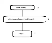 The figure shows a simple graph coloring example with colors as vertices, such that no two vertices which are joined by an edge have the same color. The available colors at each vertex are shown. The colors yellow, green, brown, red, blue, pink represent vertex Y and are fully interchangeable by definition. For example, substituting maroon for green in the solution orange|X (orange for X), green|Y will yield another solution.