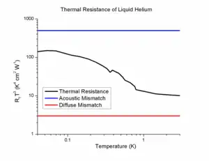 The acoustic mismatch theory predicted a very high thermal resistance (low thermal conductance) at solid-helium interfaces. This is problematic for researchers working at ultra-cold temperatures because it greatly impedes cooling rates at low temperatures such as in dilution refrigerators.[12] Fortunately such a large thermal resistance was not observed due to many mechanisms which promoted phonon transport. In liquid helium, Van der Waals forces actually work to solidify the first few monolayers against a solid. This boundary layer functions much like an anti-reflection coating in optics, so that phonons which would typically be reflected from the interface actually would transmit across the interface. This also helps to understand the pressure independence of the thermal conductance. The final dominant mechanism to anomalously low thermal resistance of liquid helium interfaces is the effect of surface roughness, which is not accounted for in the acoustic mismatch model. For a more detailed theoretical model of this aspect see the paper by A. Khater and J. Szeftel.[13] Like electromagnetic waves which produce surface plasmons on rough surfaces, phonons can also induce surface waves. When these waves eventually scatter, they provide another mechanism for heat to transfer across the interface. Similarly, phonons are also capable of producing evanescent waves in a total internal reflection geometry. As a result, when these waves are scattered in the solid, additional heat is transferred from the helium beyond the prediction of the acoustic mismatch theory. For a more complete review on this topic see the review by Swartz.[14]