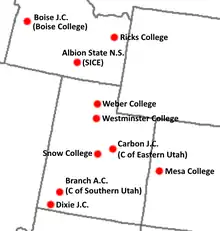 - ↑ ICAC suspended its operations for the 1943–1945 seasons due to World War II. Carbon, Dixie, Mesa, Snow, and Branch did not miss a season immediately before or after of this period, so their membership is considered uninterrupted.