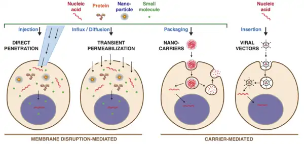 Membrane disruption-mediated techniques involve creating temporary holes in the cell membrane and delivering the cargo molecules via either [1][11]