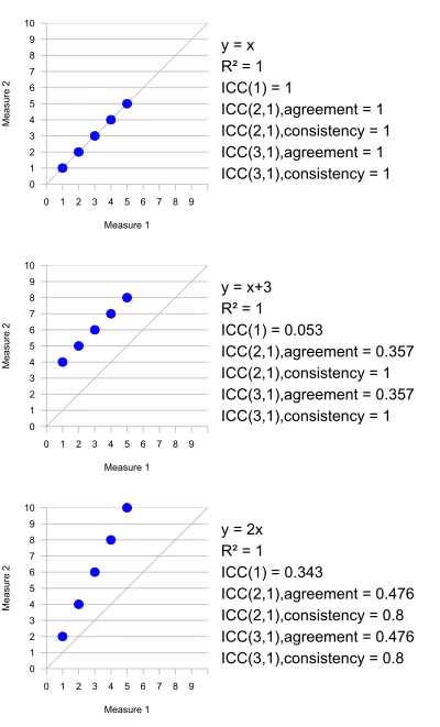An important property of the Pearson correlation is that it is invariant to application of separate linear transformations to the two variables being compared. Thus, if we are correlating X and Y, where, say, Y = 2X + 1, the Pearson correlation between X and Y is 1 a perfect correlation. This property does not make sense for the ICC, since there is no basis for deciding which transformation is applied to each value in a group. However, if all the data in all groups are subjected to the same linear transformation, the ICC does not change.