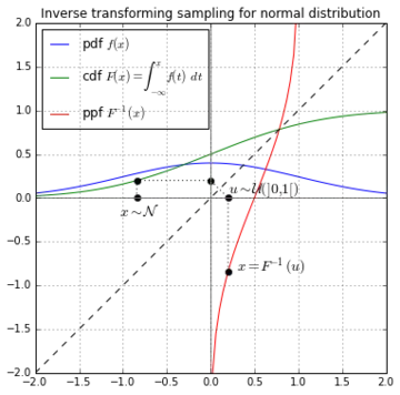 Inverse transformation sampling takes uniform samples of a number between 0 and 1, interpreted as a probability, and then returns the smallest number such that for the cumulative distribution function of a random variable. For example, imagine that is the standard normal distribution with mean zero and standard deviation one. The table below shows samples taken from the uniform distribution and their representation on the standard normal distribution.