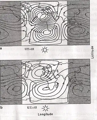 The main driver of the Sq current is the external (1, -2) tidal wave mode. Due to its constant phase with altitude, is most efficient to drive coherent winds at dynamo layer height,[15] while the currents generated by the internal modes interfere destructively at various heights.[16] A Fourier analysis shows a semidiurnal component with an amplitude of 1 /2 of that of the diurnal component, phase shifted by 180°. This appears to be the result of nonlinear coupling between the product of the diurnally varying wind and the diurnally varying conductivity .[17] The centers of the daytime vortices show a day to day variability. This can be attributed to the internal tidal modes which are sensitive to the varying meteorological conditions in the lower and in the middle atmosphere, in part also to solar activity.