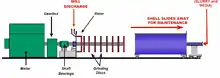The ground product is separated from the grinding medium at the discharge end of the mill. This is achieved without using screens by using a patented product separator that consists of a rotor and a displacement body (see Figure 2 and Figure 4).[10] The relatively short distance between the last disk results in a centrifugal action that forces coarse particles towards the mill shell, from where they flow back towards the feed end.[10] This action retains the grinding medium within the mill.[10]