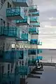 The buildings are up to ten floors tall but vary in height, with the shortest building closest to the waterfront and the tallest further back. The complex is designed and modeled after floating icebergs in the north Atlantic, both in shape and color. The buildings are divided and crisscrossed into smaller units with steep crooked roofs, to ensure that all inhabitants have ideal views of the sea. Visually, the buildings display sharp triangular edges and shifting, irregular facades. The buildings are clad in white terrazzo and have balconies made of blue glass.[2]