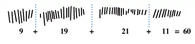 Alexander Marshack, an archaeologist from Harvard University, speculated that the Ishango bone represents numeric notation of a six-month lunar calendar after conducting a "detailed microscopic examination" of the bone.[6][1][2][7] This idea arose from the fact that the markings on the first two rows adds up to 60, corresponding with two lunar months, and the sum of the number of carvings on the last row being 48, or a month and a half.[6] Marshack generated a diagram comparing the different sizes and phases of the moon with the notches of the Ishango bone.[6] There is some circumstantial evidence to support this alternate hypothesis, being that present day African societies utilize bones, strings, and other devices as calendars.[1] However, critics in the field of archaeology have concluded that Marshack's interpretation is flawed, describing that his analysis of the Ishango bone confines itself to a simple search for a pattern, rather than an actual test of his hypothesis.[7]