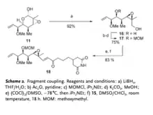 Fragment coupling of intermediate 11 and 15 would be the next step. Using lithium borohydride, lactol arrangement of reagent 11 is reduced to create alcohol 16 which could be converted to 17 as well. Coupled with phosphorane 15, reagent 16 and 17 are oxidized to synthesize aldehyde 18.